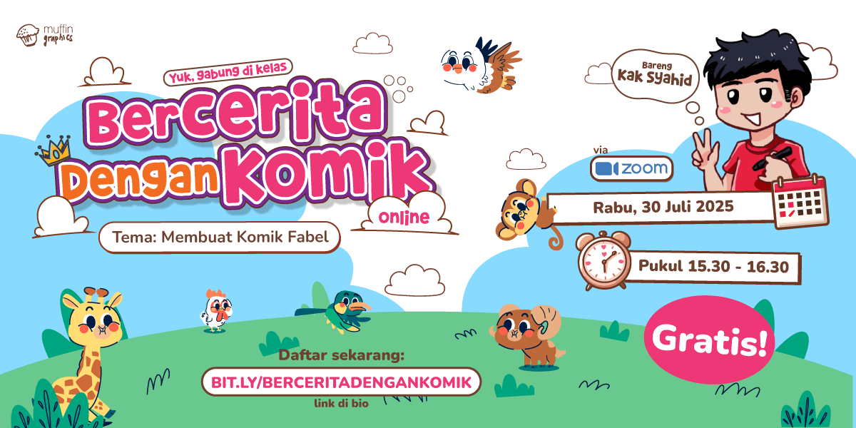 Juga nantinya di topik “Materi” kamu bisa dapetin banyak materi tentang membuat komik dari Kak Satrio yang biasa ngisi acara Bercerita dengan Komik, loh!